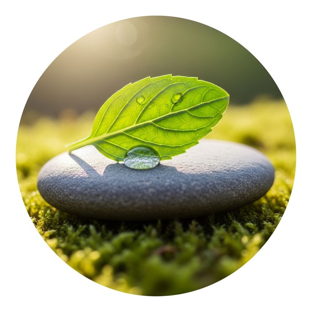 Man sitting calmly in a sunlit garden practising mindful breathing with eyes closed, surrounded by green plants and natural elements, relaxed and peaceful atmosphere